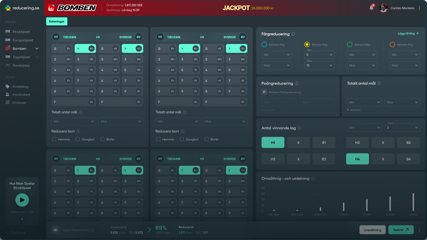 Att spela reducerade rader är det bästa och effektivaste sättet att spela Bomben på. Med hjälp av vårt smarta reduceringsverktyg kan du spela med en större ram än normalt utan att det blir dyrare. Skräddasy ditt system genom att reducera bort oönskade utfall och spetsa till systembygget ordentligt.